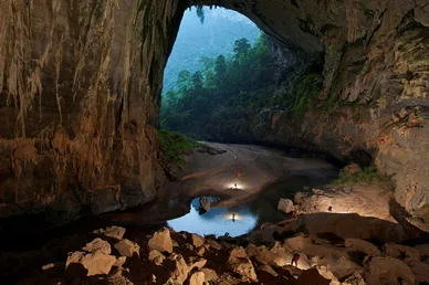 The trek starts off with a steep downhill section, leading into the jungle. A short uphill section follows and then the final long and steep descent (rocky at times) to a small stream. Follow the small stream for half an hour with multiple crossings. Arrive at Ban Doong, a small minority village inside the national park. Enjoy a delicious lunch and learn about the village. A further 20 minutes will bring you to the main river and the Hang En river valley. The route to the cave follows the river, so there are constant river crossings and your shoes will get wet! The valley is broad and very beautiful. Arriving at the cave, you will enter the small river entrance and climb over a small rocky hill to camp, located in a huge chamber with a large entrance providing daylight and a stunning view.